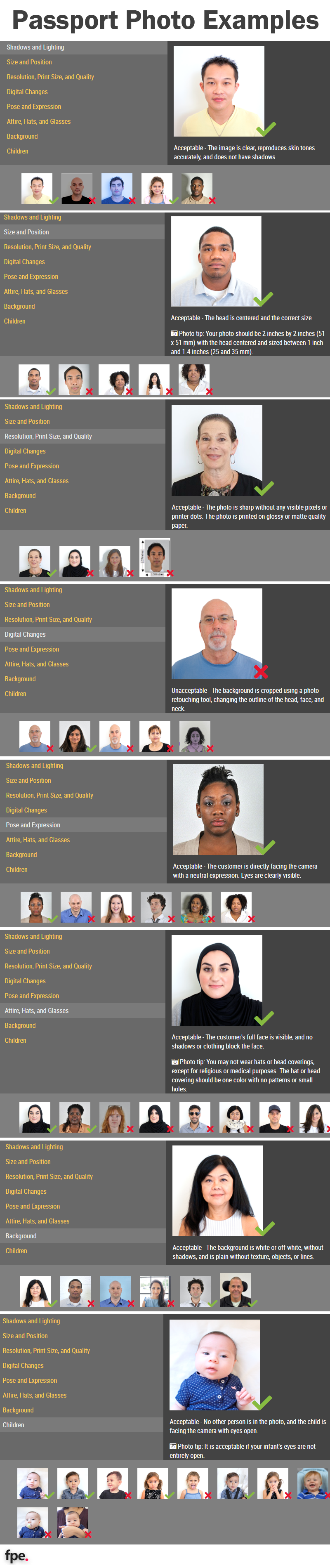 - NO GLASSES: Eyeglasses are not allowed in US passport photos.